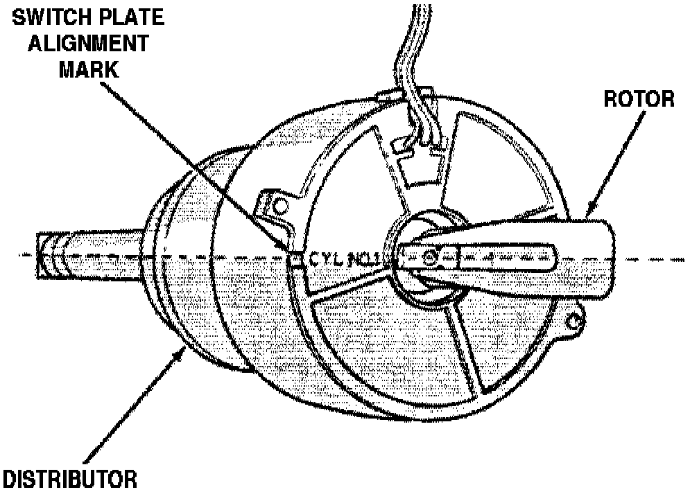 3. Slowly rotate engine clockwise with a socket on crankshaft vibration damper mounting bolt until indicating mark on damper aligns to 0degrees mark on timing chain cover. Distributor rotor should align with stamped ``CYL. No. 1'' alignment mark on distributor plate, Fig.6. If not, rotate engine another 360°.