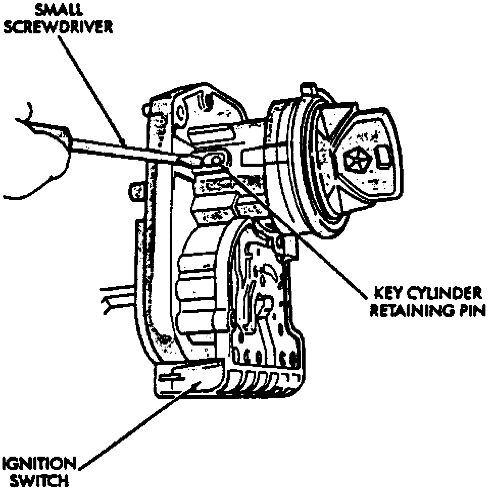 a. Insert key and place ignition switch in Lock position. Use a small screwdriver to press key cylinder retaining pin flush with surface.
