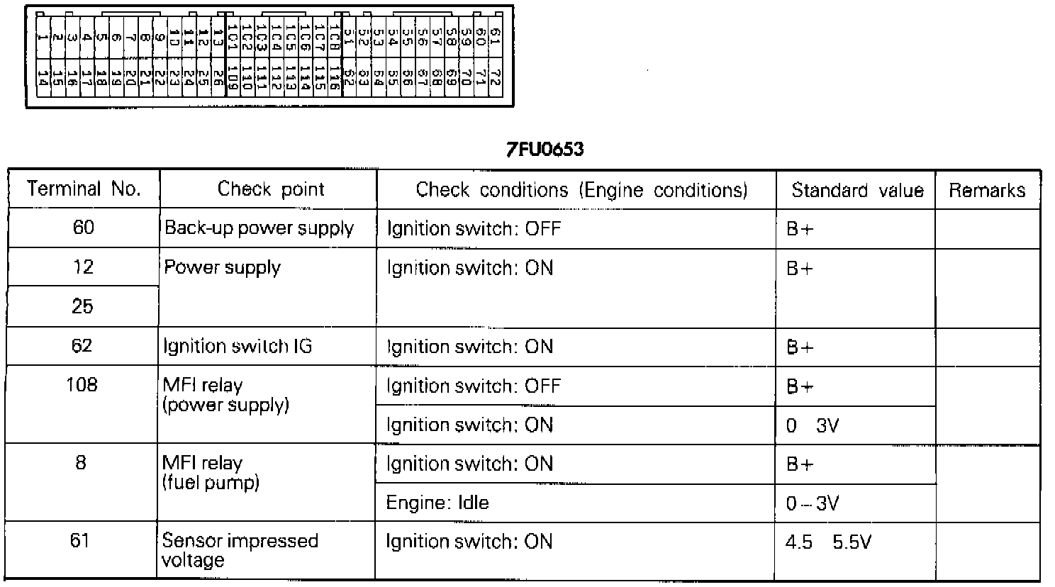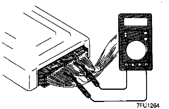 2. Insert the very thin probe from the wire side into contact with each of the terminals of the Engine Control Module (ECM) connector and check the voltage, while referring to the check chart.