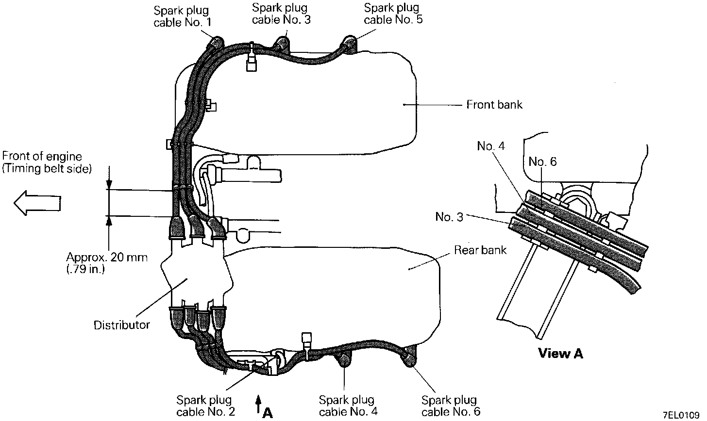 Improper arrangement of spark plug cables will induce voltage between the cables, causing miss firing and developing a surge at acceleration in high-speed operation. Therefore, be careful to arrange the spark plug cables properly by the following procedure.