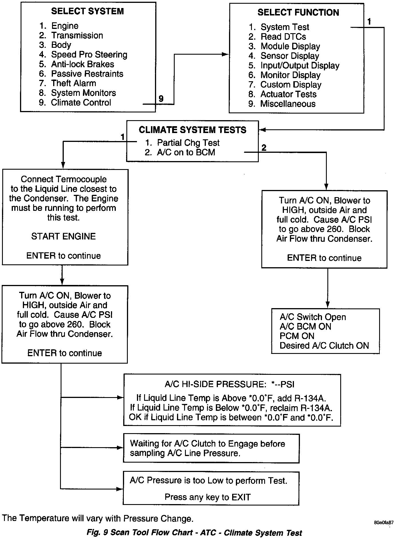 The Scan Tool Flow Charts are a sample of the areas that be tested with the scan tool. Using the Select System screen press 3 for Body, shows the items that can be tested. Pressing 9 for Climate Control shows the items that can be tested.