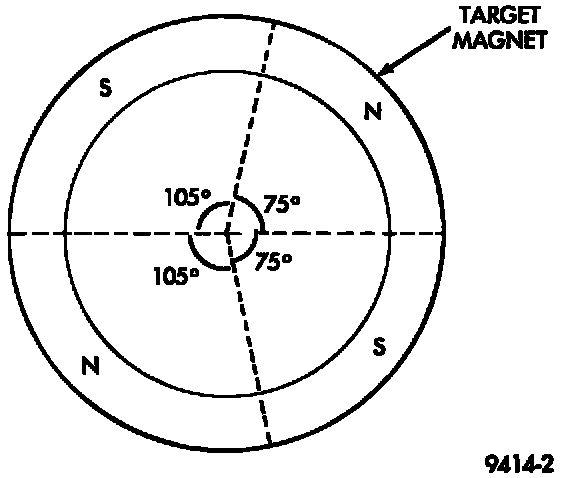 The camshaft position sensor attaches to the rear of the cylinder head (Fig. 5). A target magnet attaches to the rear of the camshaft and indexes to the correct position (Fig. 6). The target magnet has four different poles arranged in an asymmetrical pattern. A.': the target magnet rotates, the camshaft position sensor senses the change in polarity (Fig. 7). The sensor output switch switches from high (5.0 volts) to low (0.30 volts) as the target magnet rotates. When the north pole of the target magnet passes under the sensor, the output switches high. The sensor output switches low when the south pole of the target magnet passes underneath.
