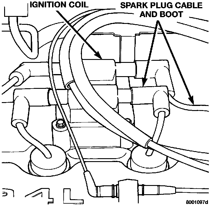 The coil assembly consists of independent coils molded together (Fig. 38). The coil assembly is mounted on the intake manifold. High tension leads route to each cylinder from the coil. The coil fires two spark plugs every power stroke. One plug is the cylinder under compression, the other cylinder fires on the exhaust stroke. The PCM determines which of the coils to charge and fire at the correct time.