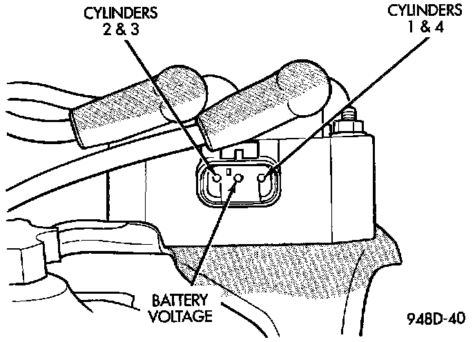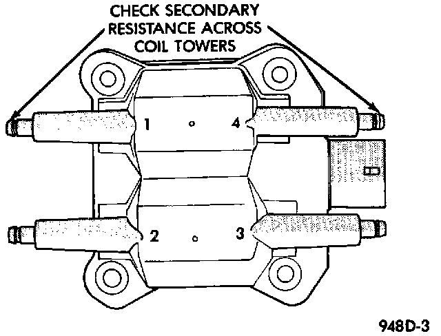Coil one fires cylinders 1 and 4, coil two fires cylinders 2 and 3. Each coil tower is labeled with the number of the corresponding cylinder.