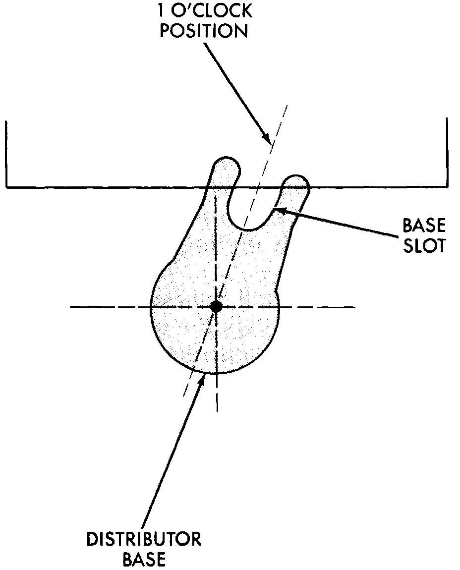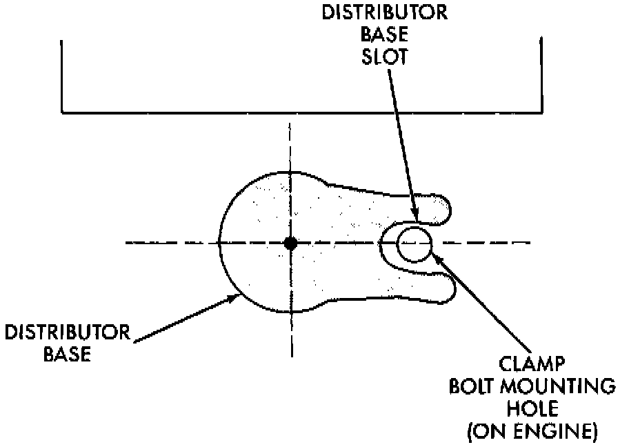 d. Centerline of slot at base of distributor is aligned to centerline of distributor hold-down bolt hole on engine block.