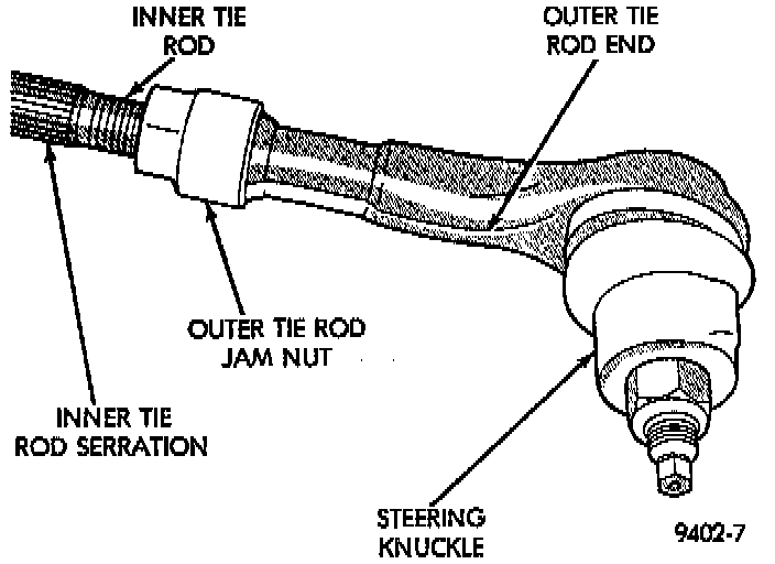 7. Loosen inner to outer tie rod end jam nuts. Grasp inner tie rods at serrations and rotate tie rods to set the front wheel Toe to the preferred specification.