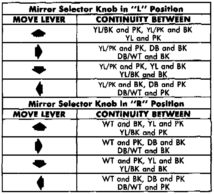 7. Use two jumper wires, one connected to a 12-volt battery feed, and the other connected to a good body ground. See the Power Mirror Test chart for the correct jumper wire connections at the power mirror switch wire harness connector (wire harness side, not switch side). If the mirror(s) don't respond as indicated in the chart, remove the mirror as described and check those circuits between the mirror and the switch for a short or open. If not OK, repair the circuits as required. If the circuits are OK, replace the faulty power outside mirror assembly.
