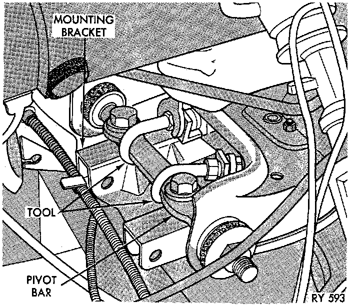 Camber and caster angle adjustments involve repositioning the upper suspension arm pivot bar. Alignment adjustments are accomplished by changing the position of the pivot bar. Adjuster Set C-4581, or equivalent is used to adjust the camber and caster angles.