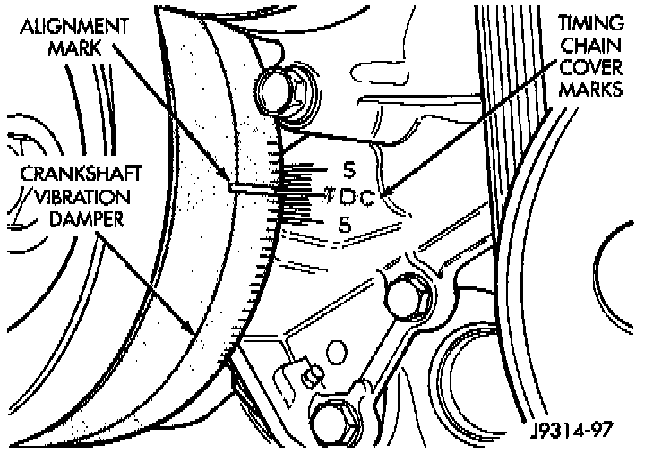 7. Slowly rotate engine clockwise, as viewed from front, until indicating mark on crankshaft vibration damper is aligned to 0 degree (TDC) mark on timing chain cover.