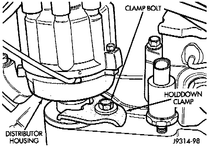 5. Install distributor holddown clamp and clamp bolt. Do not tighten bolt at this time.