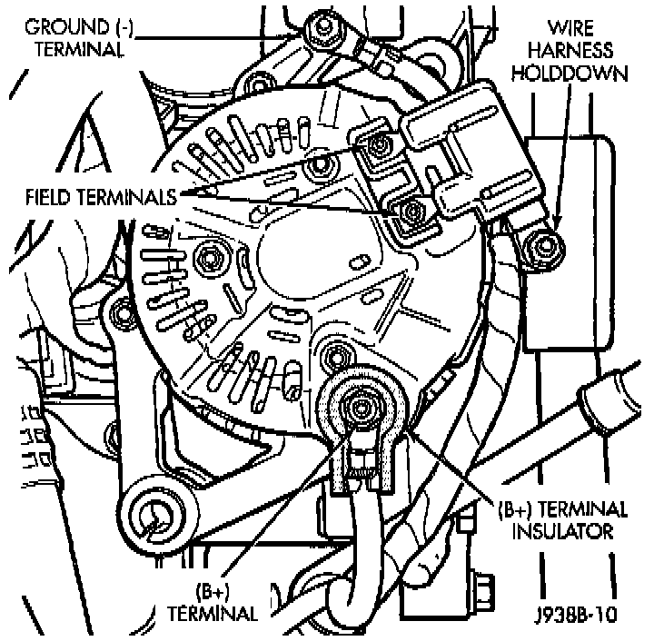 4. Remove nuts from harness holddown, battery terminal, ground terminal and 2 field terminals. Remove wire connectors. A typical generator wiring harness is shown. Wiring harness routing as shown may be slightly different depending on vehicle model and/or engine.