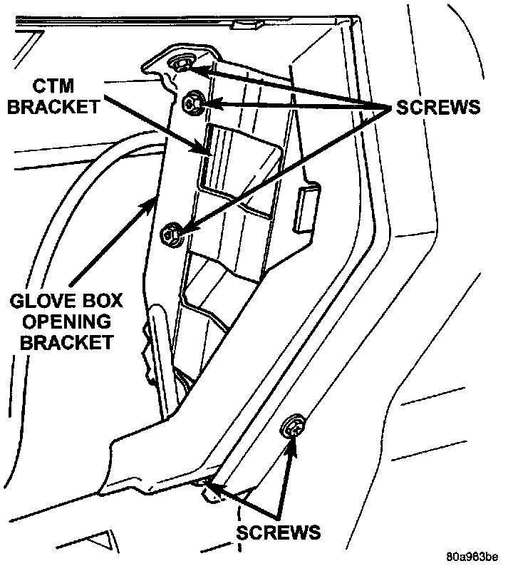 4. Remove the two screws that secure the Central Timer Module (CTM) mounting bracket to the outboard instrument panel glove box opening bracket.