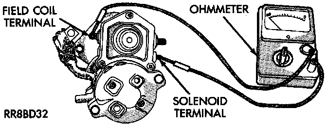 2. Check for continuity between the solenoid terminal and the field coil terminal with a continuity tester. There should be continuity. If OK, go to Step 3. If not OK, replace the faulty starter assembly.