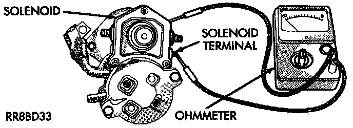 3. Check for continuity between the solenoid terminal and the solenoid case. There should be continuity. If OK, go to Step 4. If not OK, replace the faulty starter assembly.