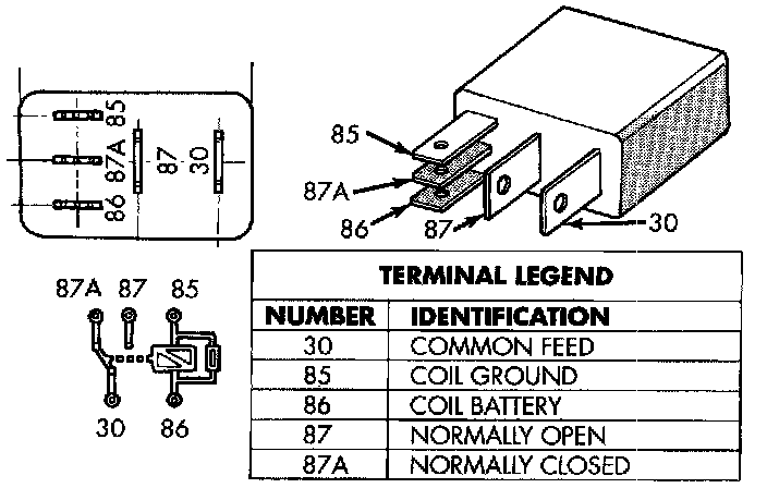 2. The relay normally closed terminal (87A) is connected to terminal 30 in the de-energized position, but is not used for this application. Go to Step 3.