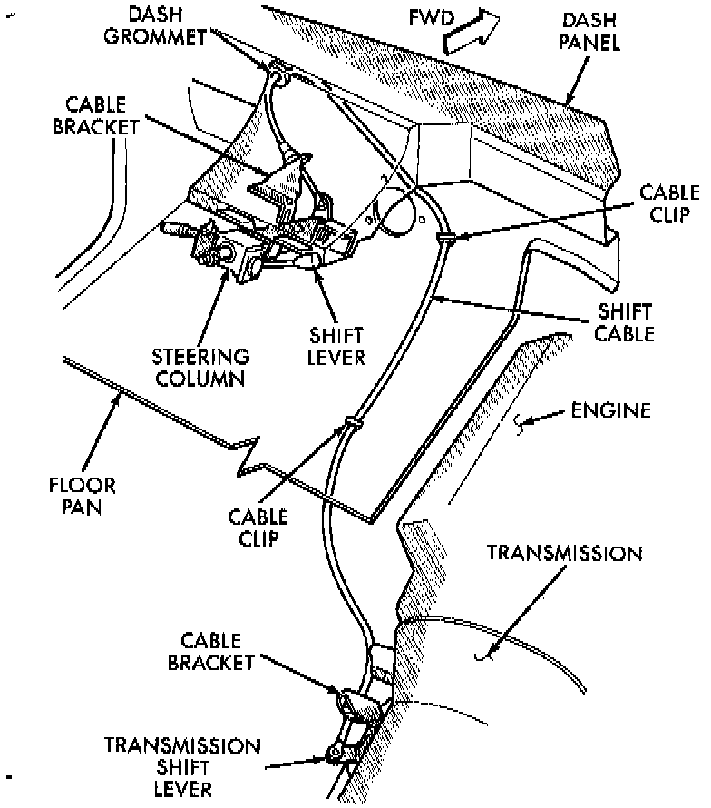 The shift cable is attached to an arm on the steering column and to the transmission shift lever. Brackets support and secure the cable at each end and clips are used to secure the cable to the floor pan. The cable is operated by an arm on the steering column shaft.