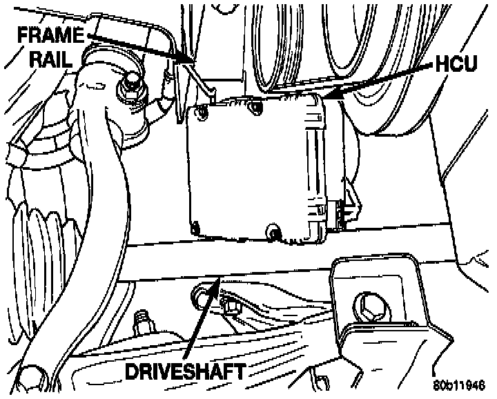 16. Remove the HCU from its mounting bracket. Then remove the HCU from the vehicle by pulling it out through the area between the right drive shaft and frame rail.