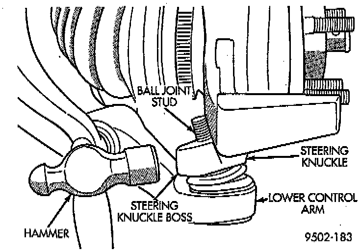 14. Turn steering knuckle so the front of the steering knuckle is facing as far outboard-in the wheel well as possible. Using a hammer strike the boss on the steering knuckle, until steering knuckle separates from stud of lower ball joint. When striking steering knuckle care MUST be taken not to hit lower control arm or ball joint grease seal.