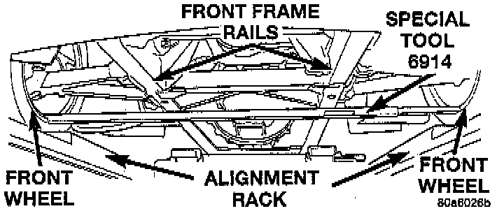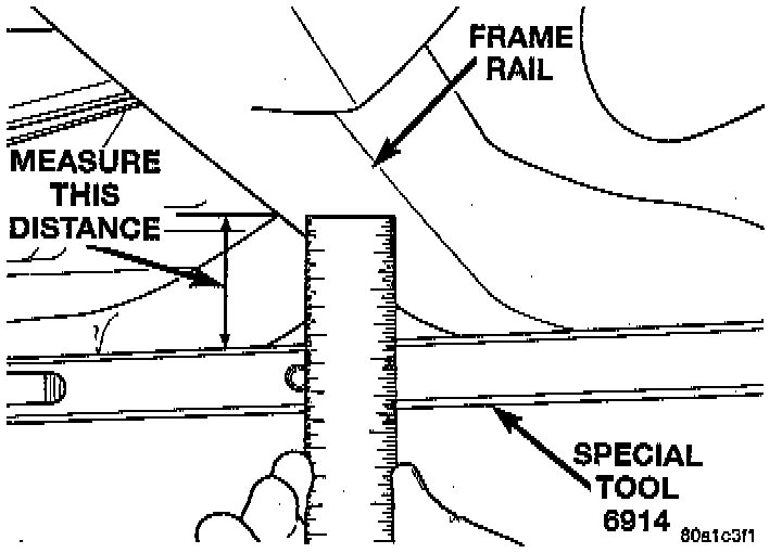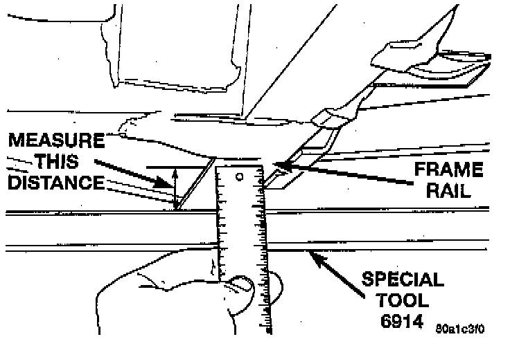9. Check the vehicle's front design height by measuring between the Height Checking Fixture, Special Tool 6914, or equivalent and the frame rail crossmember. Check the vehicle's rear design height by measuring between the Height Checking Fixture, Special Tool 6914, or equivalent and both rear frame rails.