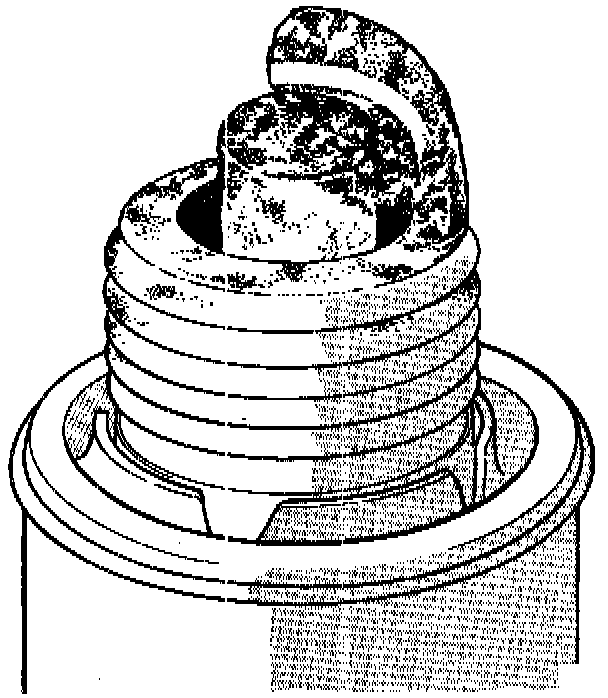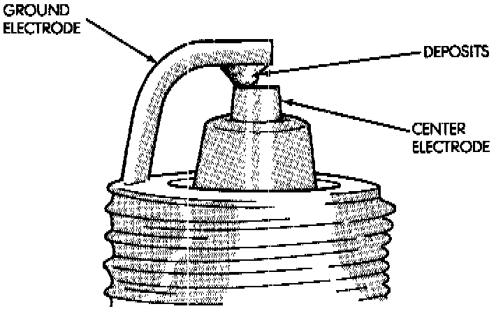 Loose deposits in the combustion chamber can cause electrode gap bridging. The deposits accumulate on the spark plugs during continuous stop-and-go driving. When the engine is suddenly subjected to a high torque load, the deposits partially liquefy and bridge the gap between the electrodes. This short circuits the electrodes. Spark plugs with electrode gap bridging can be cleaned and reused.