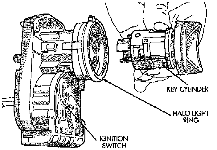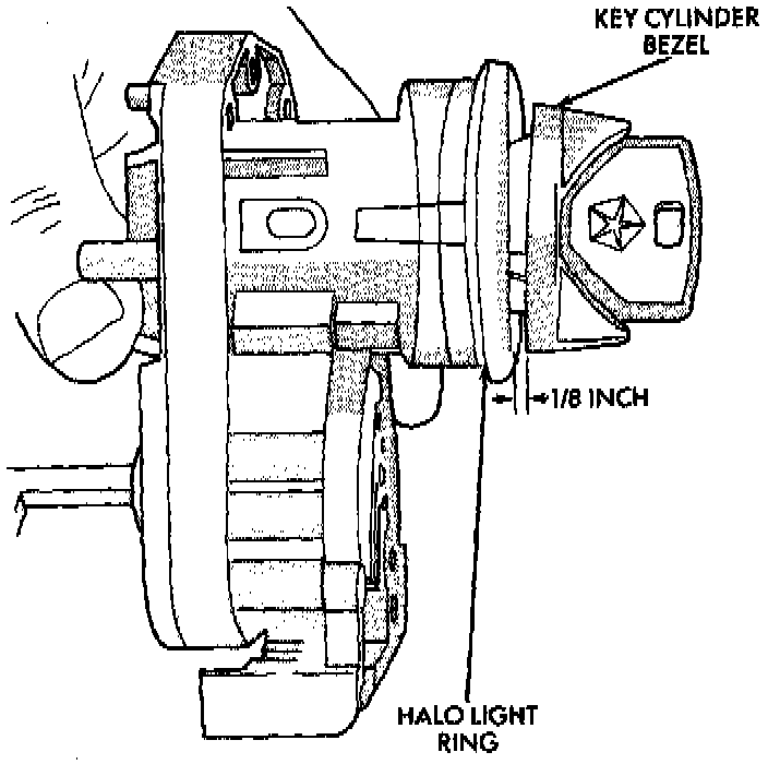 b. Rotate key clockwise to the OFF position. Key cylinder will unseat from ignition switch. When key cylinder is unseated, it will be approximately 1/8 inch away from ignition switch halo light ring. Do not attempt to remove key cylinder at this time.