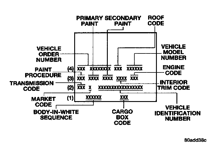 A metal body code plate is attached to the floor pan under the passenger seat. Remove the passenger seat, door sill scuff plate and pull back the carpet to access the body code plate. There are seven lines of information on the body code plate. Lines 5, 6, and 7 are not used to define service information. Information reads from left to right, starting with line 4 in the center of the plate to line 1 at the bottom of the plate.