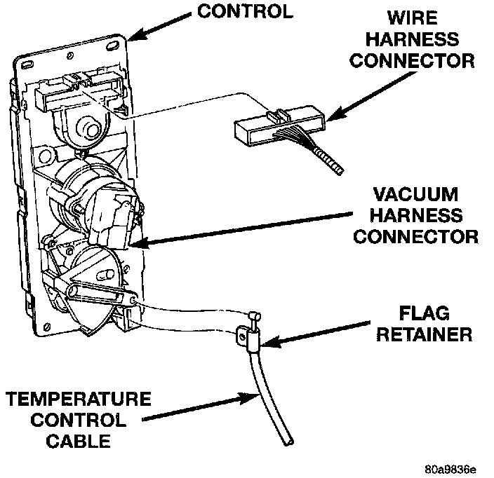 2. Connect the temperature control cable housing flag retainer to the receptacle on the back of the heater-A/C control.