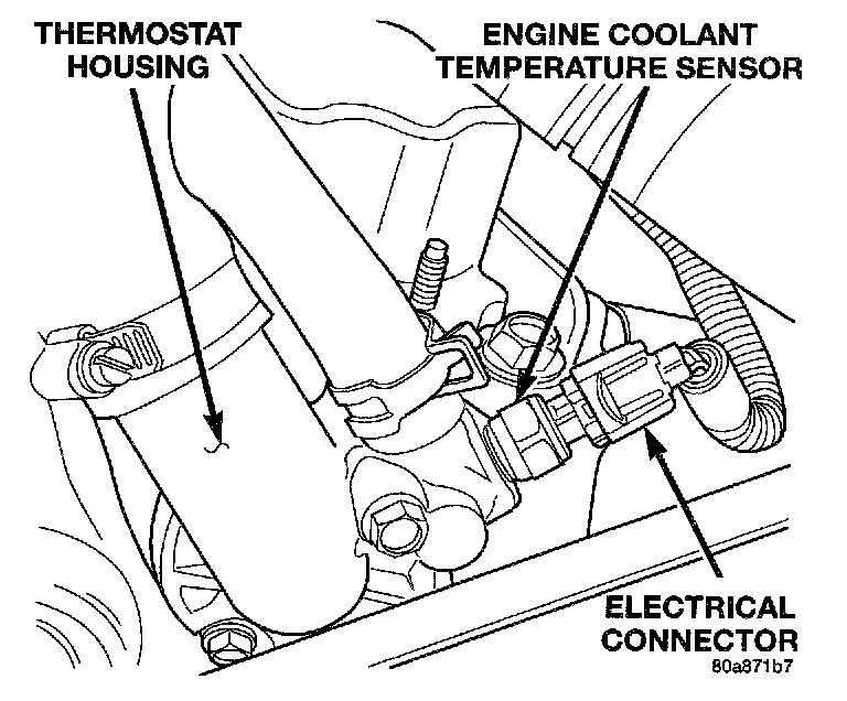 The engine coolant temperature sensor is installed in the thermostat housing and protrudes into the water jacket. The sensor provides an input voltage to the powertrain control module (PCM) relating coolant temperature. The PCM uses this input along with inputs from other sensors to determine injector pulse width and ignition timing. As coolant temperature varies, the coolant temperature sensor's resistance changes. The change in resistance results in a different input voltage to the PCM.