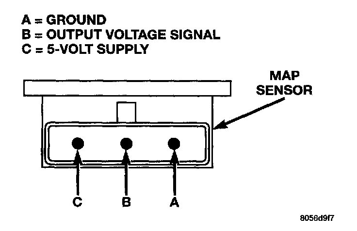 2. Test the MAP sensor output voltage at the MAP sensor connector between terminals A and B. With the ignition switch ON and the engine OFF, output voltage should be 4-to-5 volts. The voltage should drop to 1.5-to-2.1 volts with a hot, neutral idle speed condition.