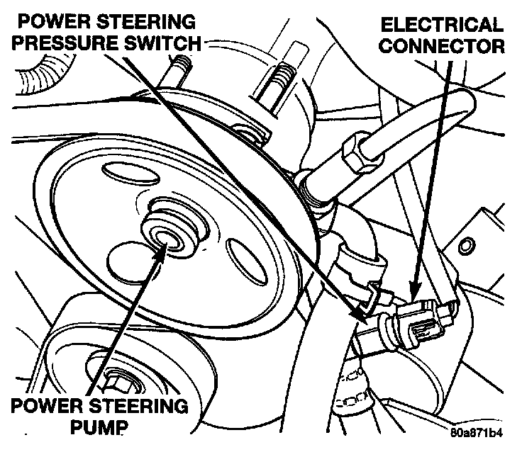 This switch is not used with 3.9/5.2/5.9L engines. The power steering pressure switch is installed in the power steering high-pressure hose (line).