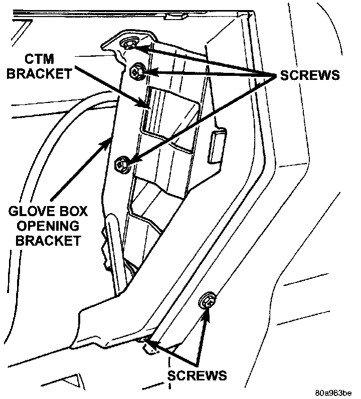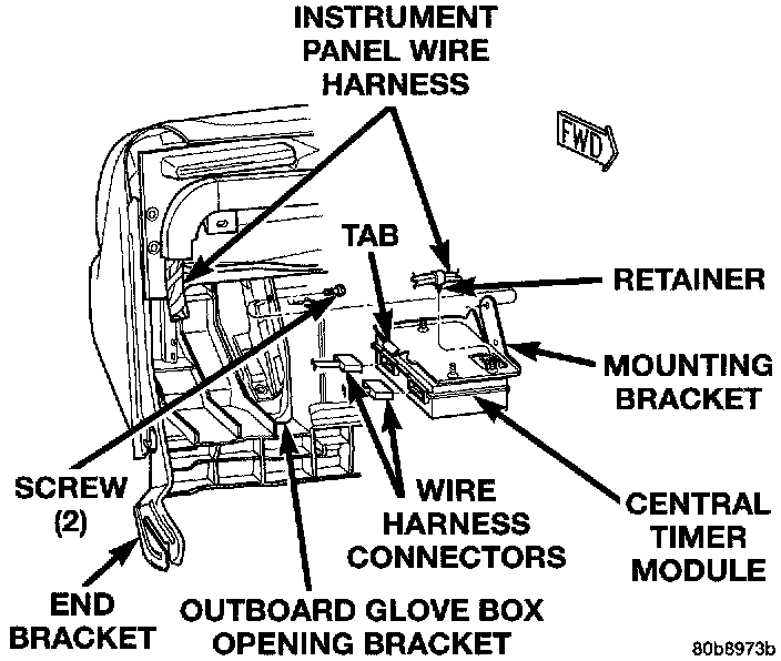 6. Install and tighten the two screws that secure the Central Timer Module (CTM) mounting bracket to the bracket on the outboard side of instrument panel glove box opening. Tighten the screws to 2.2 N.m (20 in. lbs.).