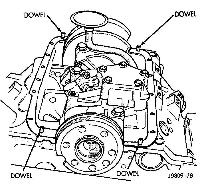 7. Remove the dowels. Install the remaining oil pan bolts. Tighten these bolts to 24 Nm (215 inch lbs.).