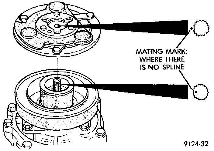 8. Note the machined mating splines on the compressor shaft and in the clutch plate hub.