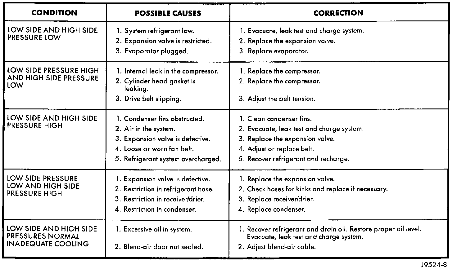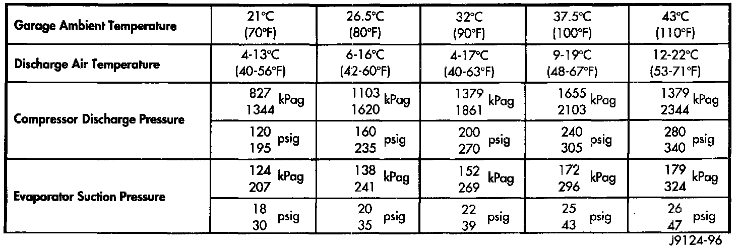 7. With the compressor clutch engaged, record the panel outlet discharge air temperature, the discharge pressure (high side), and the suction pressure (low side).