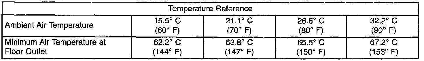 Engine coolant is delivered to the heater core through two heater hoses. With the engine idling at normal operating temperature, set the temperature control knob in the full hot position, the mode control switch knob in the floor position, and the blower motor switch knob in the highest speed position. Using a test thermometer, check the temperature of the air being discharged at the heater-A/C housing floor outlets. Compare the test thermometer reading to the Temperature Reference chart.