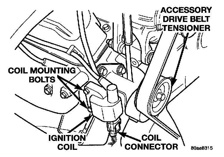 The coil is mounted to a bracket that is bolted to the front of the right engine cylinder head. This bracket is also used to mount the automatic belt tensioner.