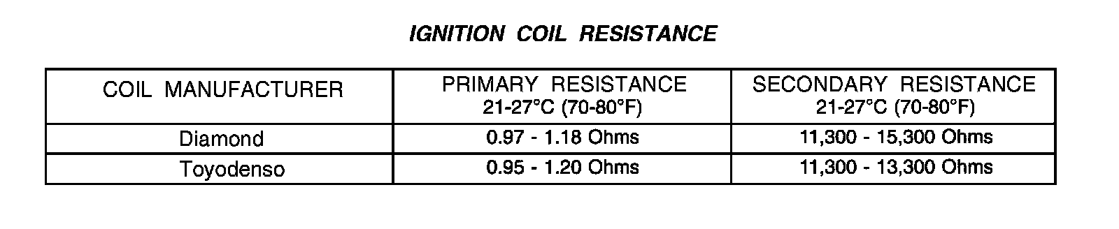 Inspect the ignition coil for arcing. Test the coil according to coil tester manufacturer's instructions. Test the coil primary and secondary resistance. Replace any coil that does not meet specifications. Refer to the IGNITION COIL RESISTANCE chart.