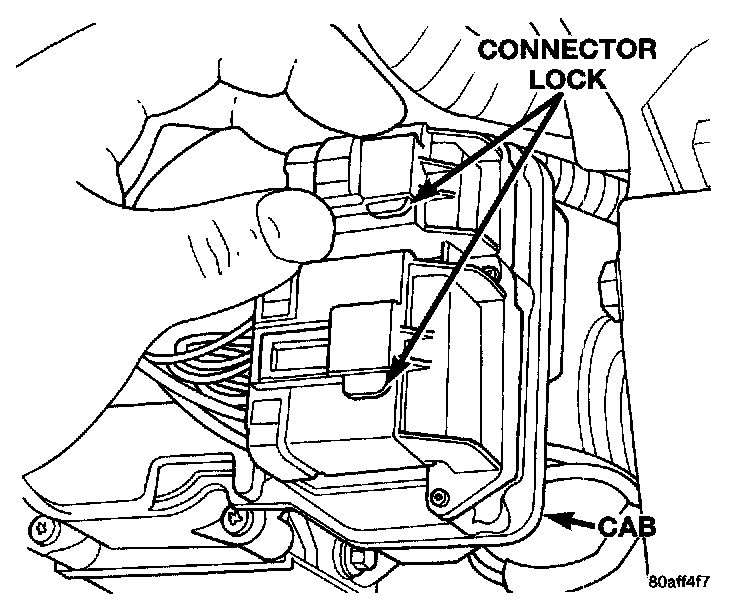 7. Push the harness connector locks to release the locks, then remove the connectors from the CAB.