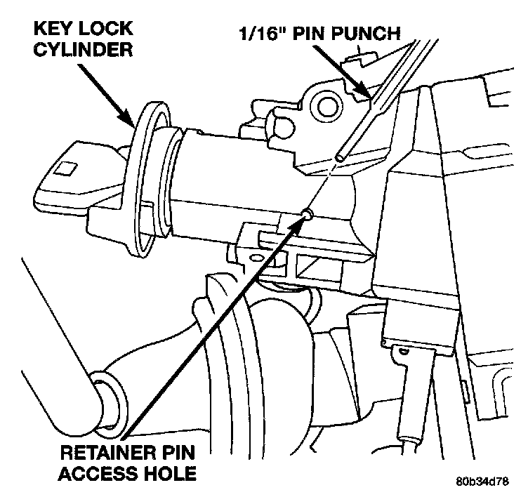 c. Press in on pin punch to release lock cylinder retainer pin while releasing key to RUN position.