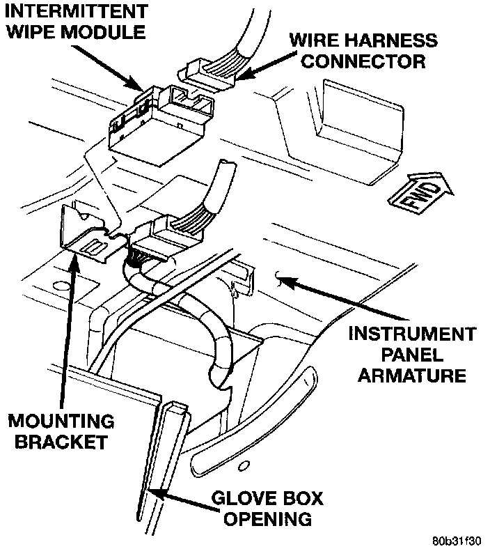 3. Reach through and above the glove box opening to access the intermittent wipe module. Push the module towards the front of the vehicle to disengage the snap-fit slot on the intermittent wipe module from the slide tab of the mounting bracket on the instrument panel armature.