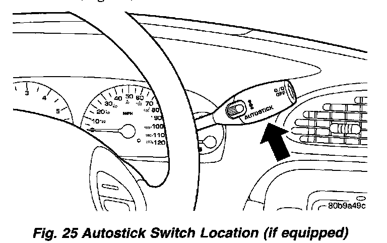 Autostick is a driver-interactive transaxle feature that offers manual gear shifting capability. The control switch is part of the transaxle gear shift lever as shown in (Fig. 25).