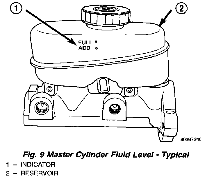 Always clean the master cylinder reservoir and caps before checking fluid level. If not cleaned, dirt could enter the fluid.The fluid fill level is indicated on the side of the master cylinder reservoir.