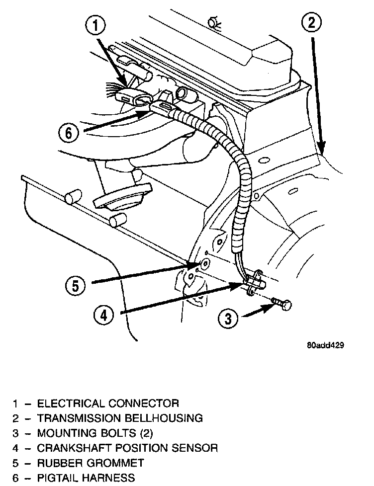 The Crankshaft Position Sensor is mounted in the transmission bellhousing at left/rear side of engine block.