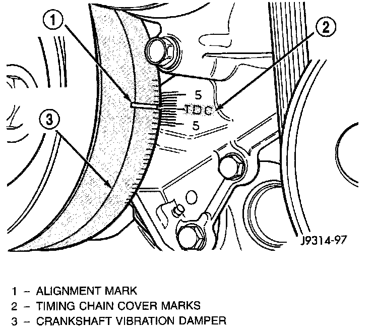7. Slowly rotate engine clockwise, as viewed from front, until indicating mark on crankshaft vibration damper is aligned to 0 degree (TDC) mark on timing chain cover.