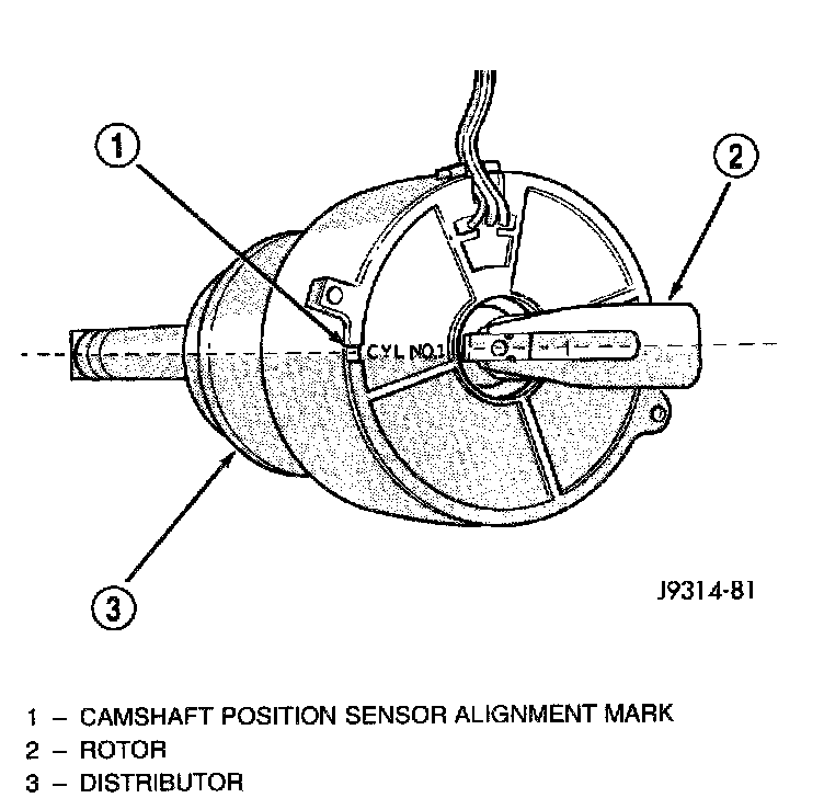 8. The distributor rotor should now be aligned to the CYL. NO.1 alignment mark (stamped) into the camshaft position sensor. If not, rotate the crankshaft through another complete 360 degree turn. Note the position of the number one cylinder spark plug cable (on the cap) in relation to rotor. Rotor should now be aligned to this position.