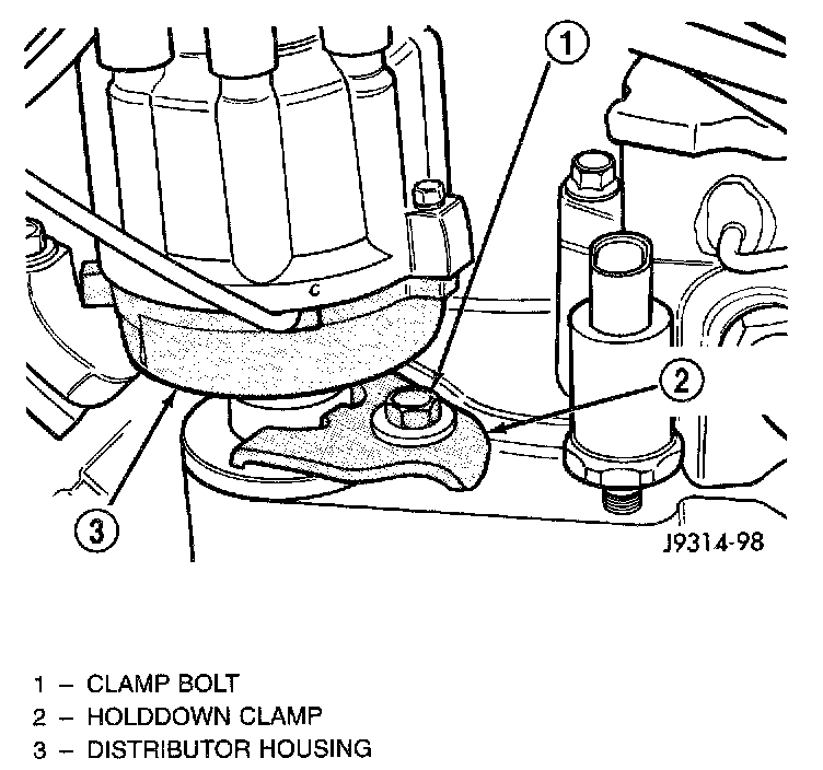 5. Install distributor holddown clamp and clamp bolt. Do not tighten bolt at this time.