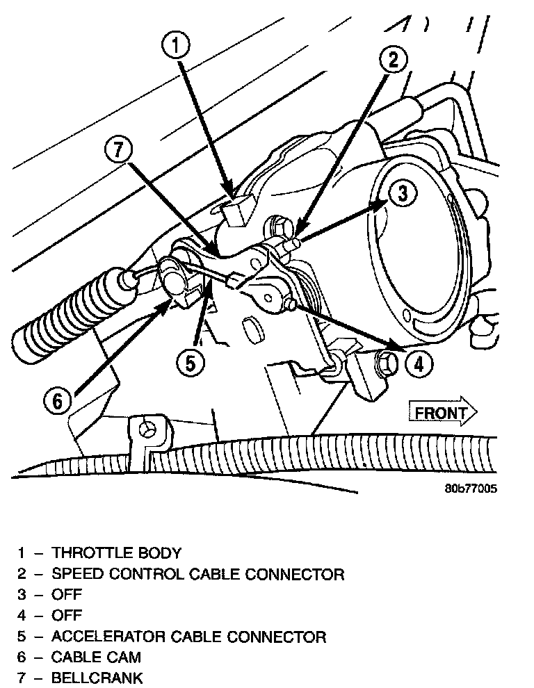 6. Using finger pressure only, disconnect speed control cable connector at throttle body bellcrank pin by pushing connector off bellcrank pin towards front of vehicle. DO NOT try to pull connector off perpendicular to the bellcrank pin. Connector will be broken.
