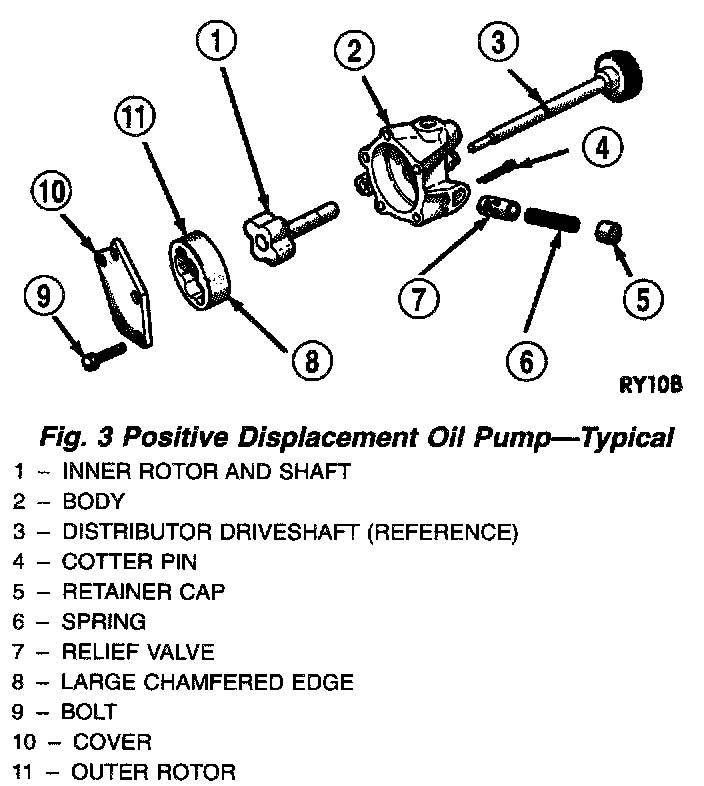 A gear-type positive displacement pump (Fig. 3) is mounted at the underside of the rear main bearing cap. The pump uses a pick-up tube and screen assembly to gather engine oil from the oil pan.