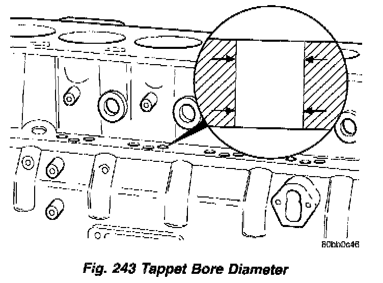 Inspect the tappet bores for scoring or excessive wear (Fig. 243). If out of limits, replace the cylinder block.