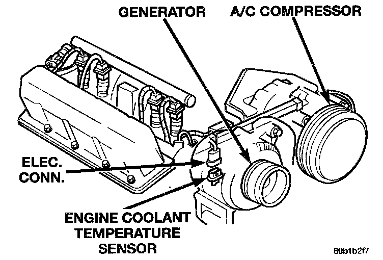 The Engine Coolant Temperature (ECT) sensor is installed into a water jacket at the front of the intake manifold located near the rear of the generator.